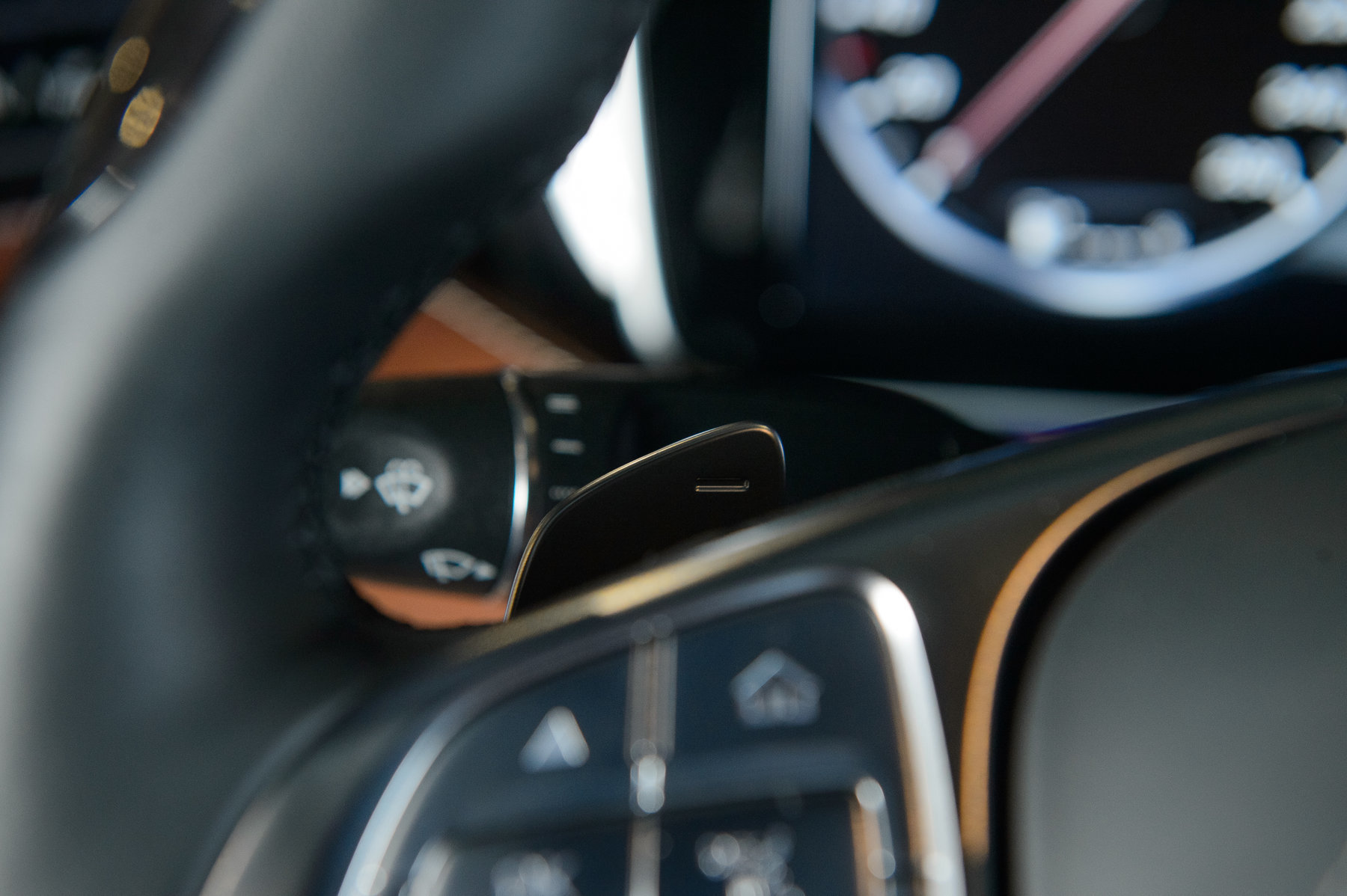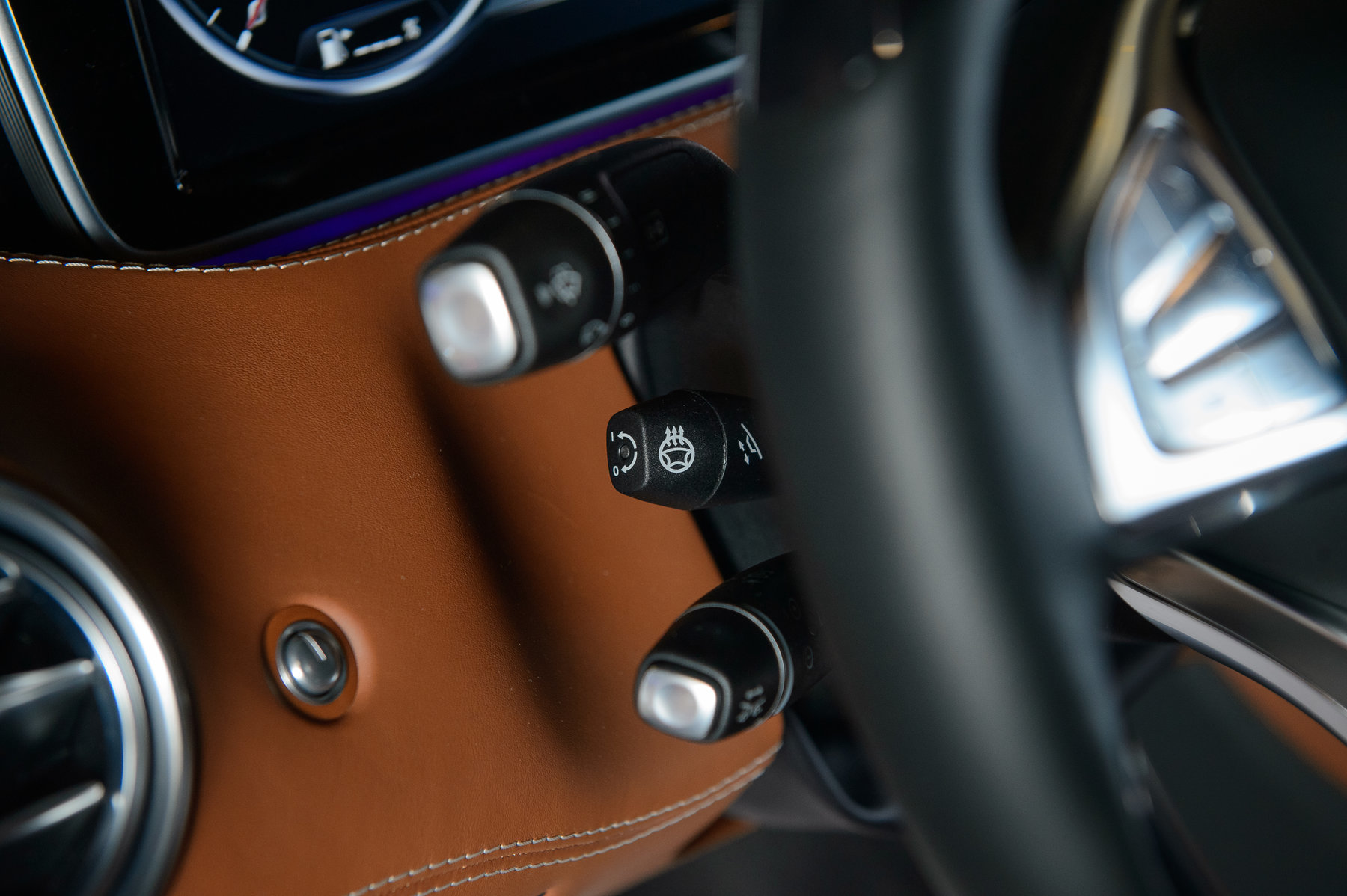 Мультифункциональное спортивное рулевое колесо с отделкой кожи и дерева.
